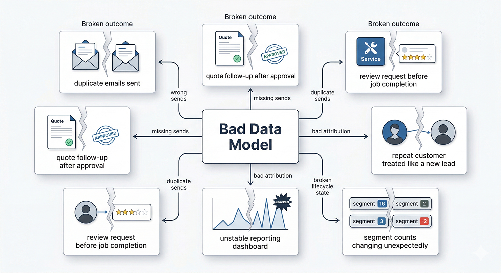 That doesn't always stop flows from running. It does stop teams from knowing whether those flows are actually working. You can't confidently tie an email recipient to a booking if the person identifier is unstable. You can't measure lift well if the quote record is detached from the messaging record. You can't reconcile flow outcomes if household, client, and job entities are floating around without a reliable relationship structure.