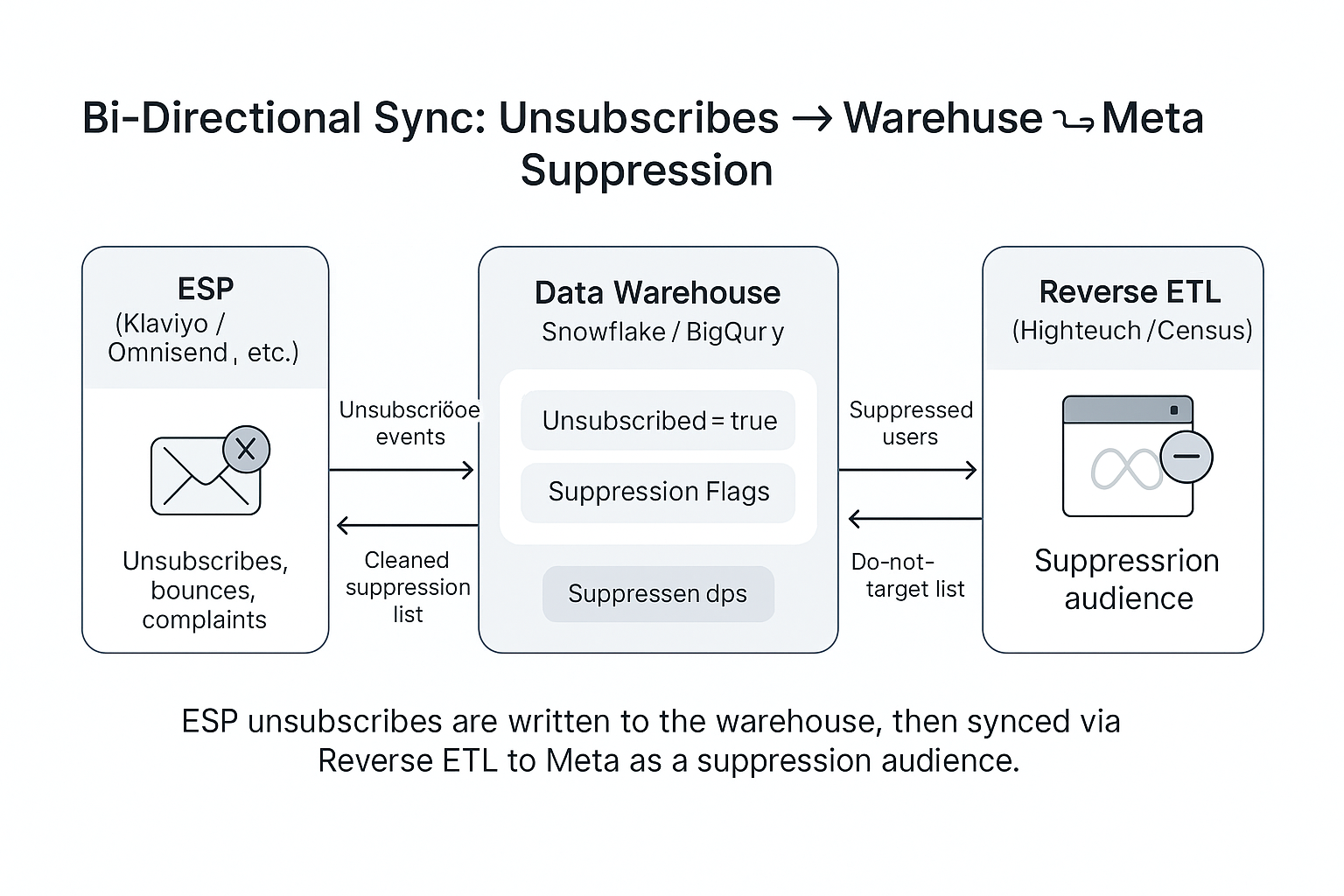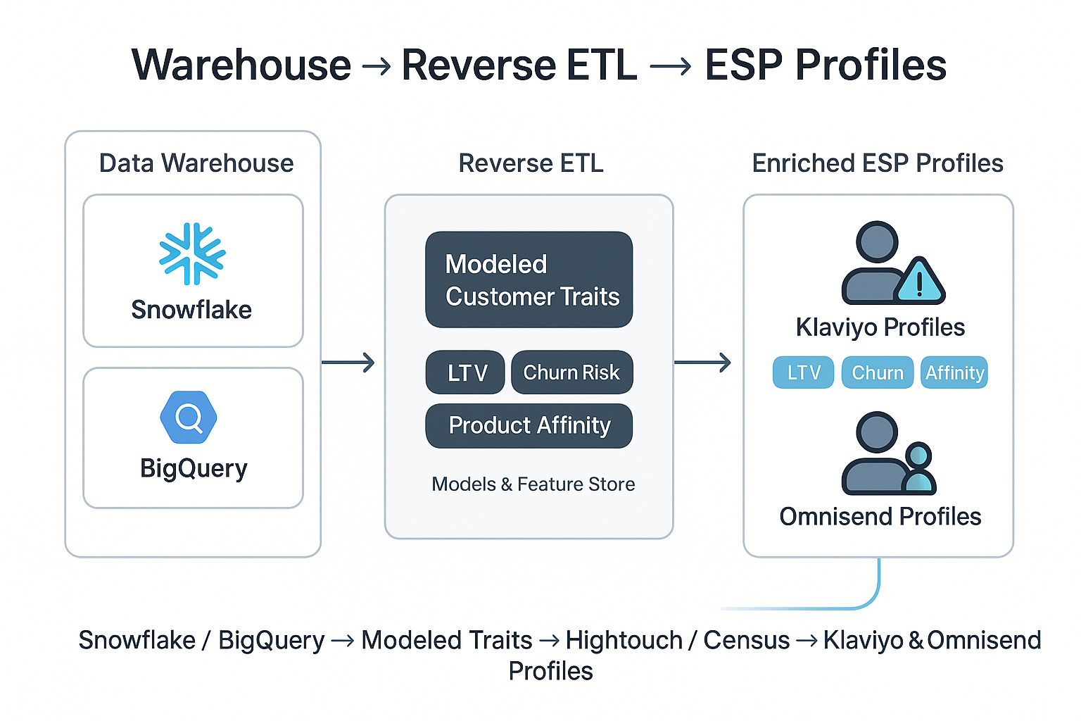Reverse ETL takes modeled data from your warehouse and pushes it into tools your marketing team actually uses—like Klaviyo, Omnisend, or Customer.io.