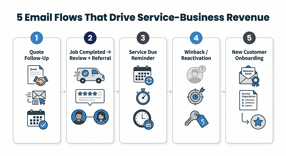 What emails should a service business send? At a minimum: quote follow-up, post-service review and referral, service-due reminders, reactivation for lapsed customers, and onboarding for new customers. Transactional emails like confirmations and receipts still matter too.